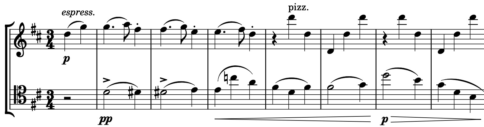 後半のオネーギンがオリガを誘う場面(譜例2)は、チェロが力強く息の長い旋律を奏で、ヴァイオリンのしなやかなメロディーが対話することで、舞踏会の華やぎに緊張と深みが生まれ、物語の先に待つ悲劇をほのめかす場面となっている。